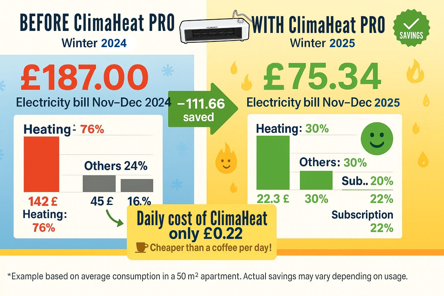 “I work from home 4 days out of 5. Before, I was heating the entire flat to be comfortable in my office. Result: £150 bill last January. Now, I plug my Climaheat Pro under my desk in the morning, and I only heat where I am. My bill has been cut in half.”