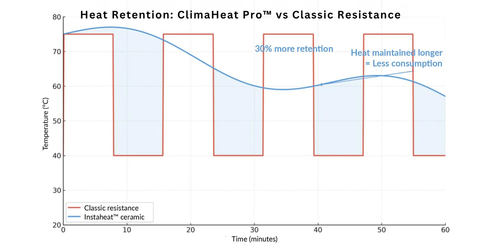 Unlike traditional metal heating elements that cool down instantly when you switch off the power, Climaheat Pro ceramic retains heat 30% longer.